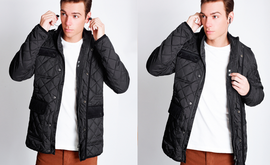 - Earphones are wired through the jacket and concealed in the collar to avoid any unnecessary tangling.