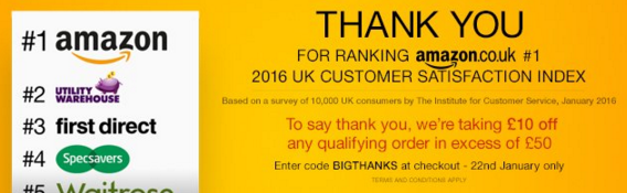 Amazon.co.uk has been ranked #1 in Customer Satisfaction amongst all UK companies in a nationwide poll of 10,000 consumers. To say thank you, Amazon.co.uk is offering customers £10 off any retail order over £50 – today only.  This can used by entering the promo code BIGTHANKS at checkout.