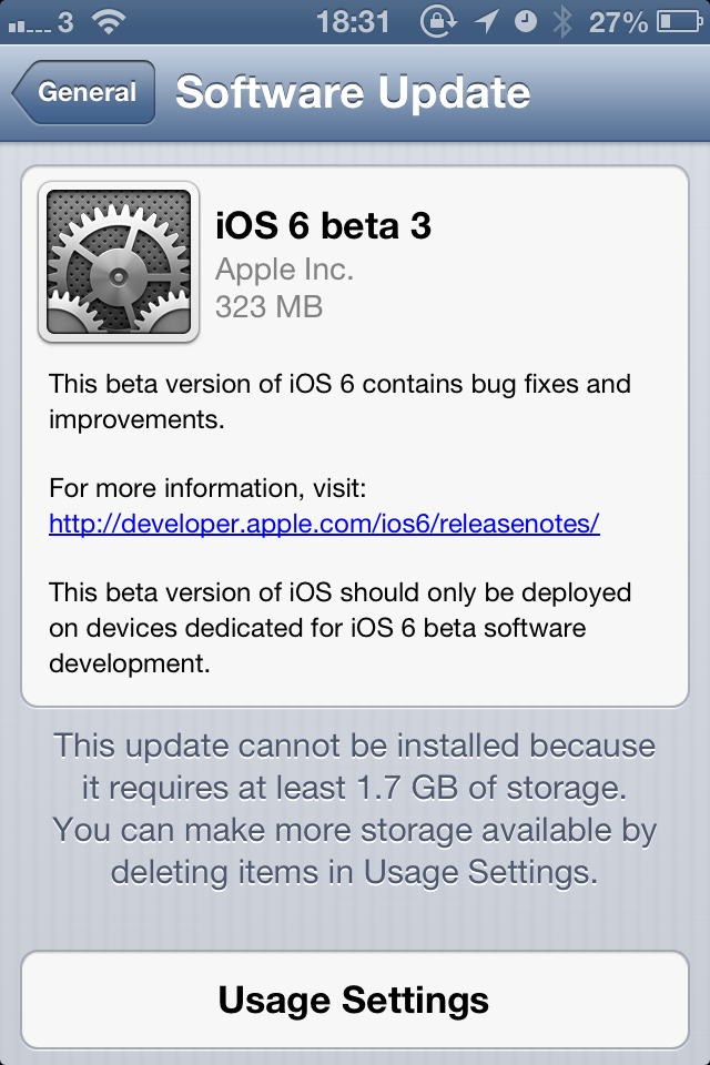 Apple have released the beta 3 of the highly anticipated iOS6 to the developers; the OTA upgrade is available by just going to the general settings and hitting the software updates button.  You might need to upgrade over WiFi as it’s about 323MB in size.  iOS 6 is launching to the public this fall with some major updates.