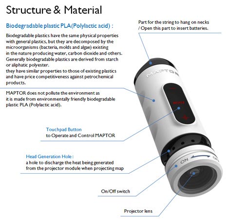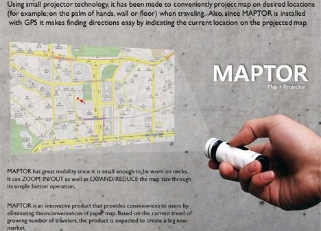 Or more commonly have you ever used a paper map and spent agees wondering where the hell you on that map? Maptor is a compact and stylish concept that combines a map and a projector that will project the desired map onto whatever surface – table, wall or even your palm. What is more, this device includes GSM that will help you to define your precise location on the map.